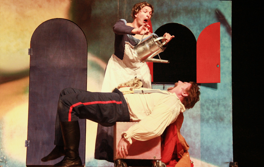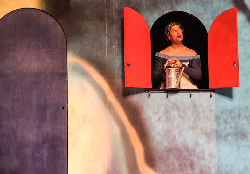 在奥丽维娅花园里,众人错落排开,一一念着独白来到窗台前,打开窗户出现各自心爱的人。当憨态可掬的托比公爵出现时,耳畔已响起零星的笑声,打开窗户却是他常用的酒瓶。大号吹响,手鼓敲起,托比爵士与追求奥莉维亚的安德鲁骑士撒起了酒疯,夸张的肢体动作和荒诞的语言令观众捧腹大笑。在薇奥拉女扮男装被戳破后,奥西诺公爵对薇奥拉深情告白,正是情到深处时,奥莉维亚的两声咳嗽,随后露出尴尬的笑容,也让全场观众不由自主地哄笑了起来。