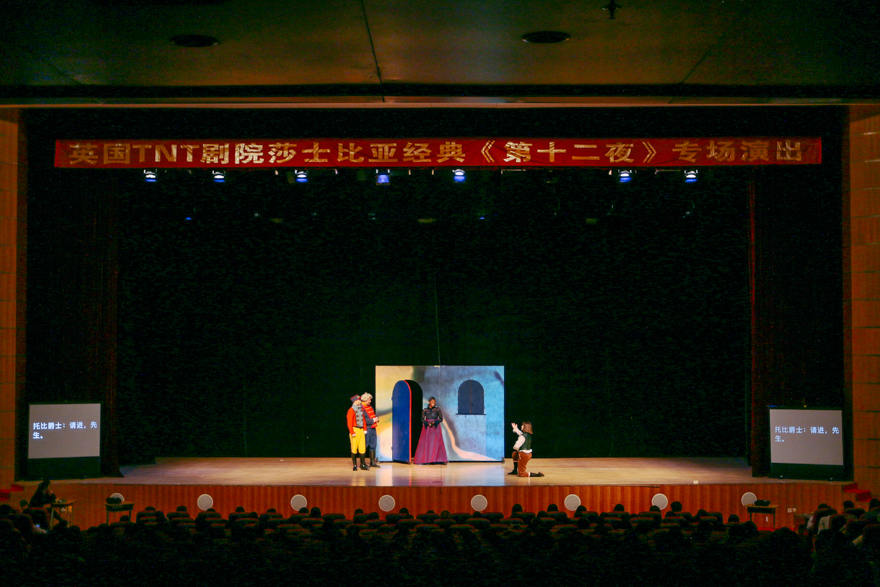 本网讯适逢莎士比亚逝世400周年演出季,时隔六年,英国TNT剧院再次来到广外演绎莎士比亚经典。4月25日和26日晚,该剧团在我校北校区云山会堂和南校区大会堂分别上演了莎士比亚著名喜剧《第十二夜》。该剧讲述的是公爵奥西诺、奥利维亚小姐与一对孪生兄妹薇奥拉和西巴斯辛4人之间的矛盾爱情故事,多条线索穿插映照,喜剧效果强烈,为广大师生带来一场精彩纷呈的艺术盛宴。