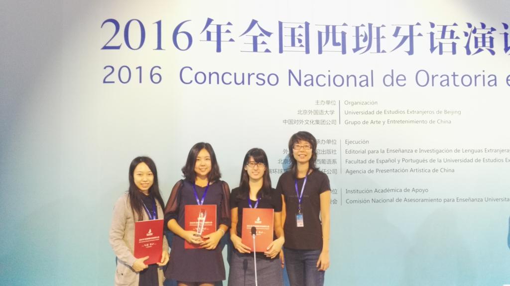本网讯经过四个月的准备和选拔,由文化部、北京外国语大学、外语教育与研究出版社共同举办的2016年全国西班牙语演讲大赛于9月24日在北京民族剧场成功举办。来自全国各地共52所大学代表队及30余名非专业的西班牙语爱好者参加了本届演讲大赛,最终包括我校在内共有18支院校代表队及一支由西语爱好者组成的队伍晋级决赛。我校西班牙语系的学生张诗怡、胡诗敏及余佩瑶同学在指导老师林婧的带领下,获得了全国二等奖。