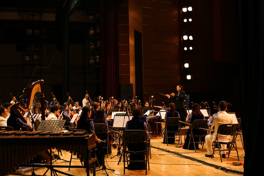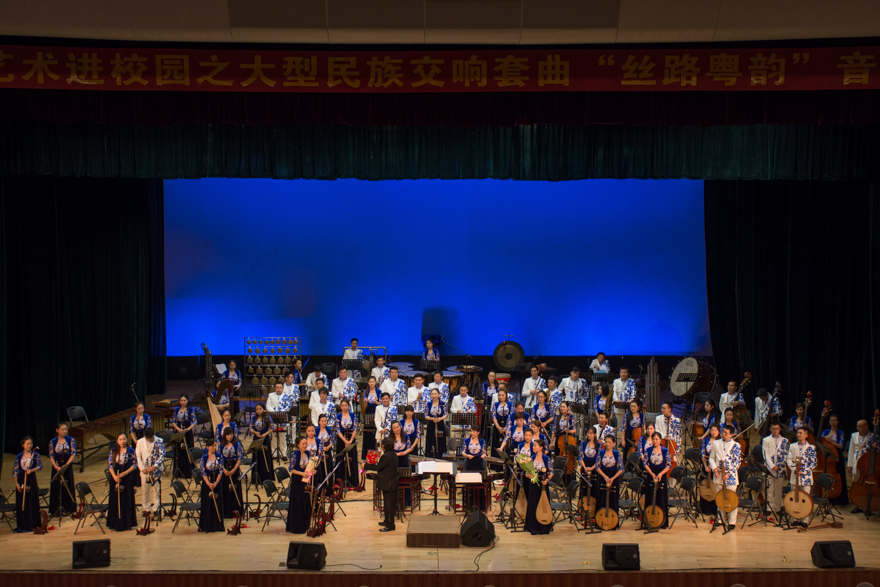 本网讯 古有百越先民远洋探索,今有南粤人民渡海交流。10月18日晚,高雅艺术进校园之大型民族交响套曲《丝路粤韵》音乐会在我校南校区大会堂举行。广东民族乐团用七个乐章,带领听众穿越历史长河,感受21世纪海上丝绸之路的历史溯源和时代魅力。音乐会由著名指挥家张列指挥。