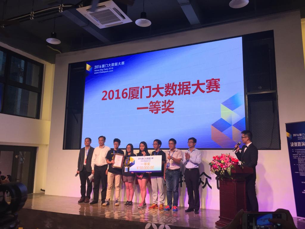 本网讯 10月30日,2016厦门大数据大赛决赛路演暨颁奖仪式在厦门湖里高新园爱特众创创业园一楼举行。我校由蒋盛益指导的数据挖掘实验室成员组成的“Beatles”队伍获一等奖,由杜剑锋指导的队伍获优胜奖,信息学院获最佳组织奖。