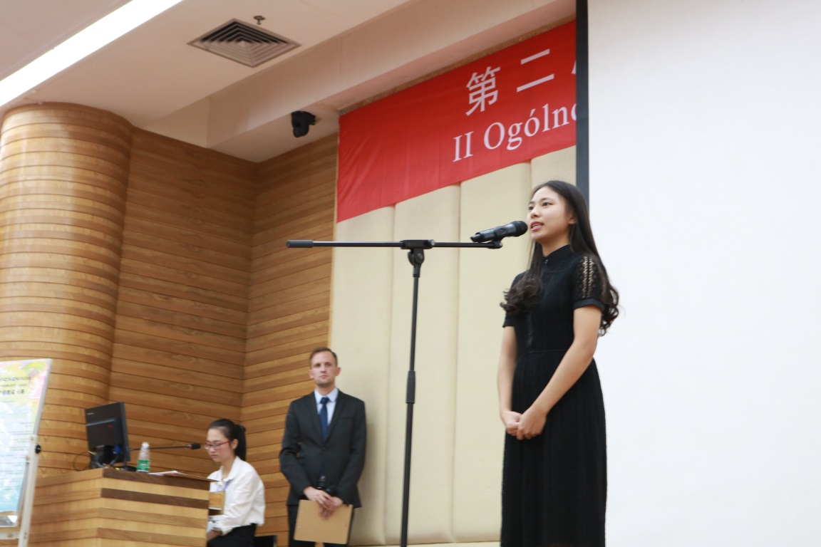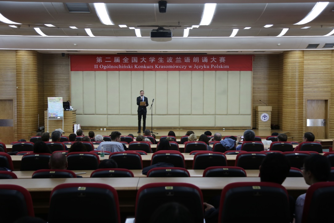 11月4日晚,第二届全国大学生波兰语朗诵大赛总决赛在我校图书馆报告厅拉开帷幕。本次大赛由中国非通用语教学研究会、波兰驻华大使馆、波兰驻华大使馆文化处、波兰驻广州总领事馆以及广东外语外贸大学等单位联合主办。大赛评委有波兰驻华大使馆文化处参赞蔡梦灵女士(MagdalenaChechońska)、波兰驻广州总领事约安娜•斯科柴克女士(JoannaSkoczek)、北京外国语大学欧语学院院长赵刚、我校波兰语系系主任茅银辉以及大赛资助单位代表(克拉科夫雅盖隆大学、西里西亚大学、托伦哥白尼大学等)。