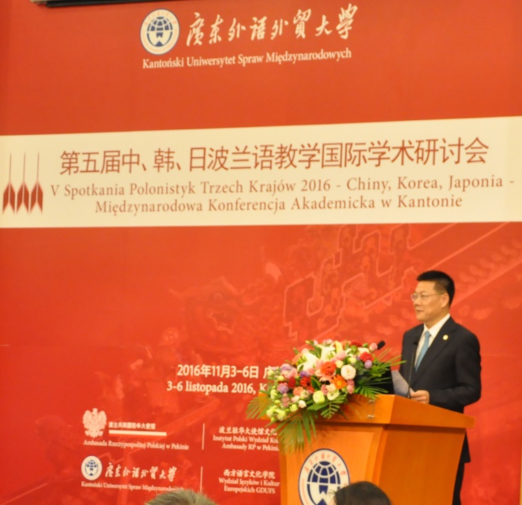 本网讯 11月3日至6日,第五届中日韩三国波兰语国际研讨会在我校举行。此研讨会是亚洲波兰语教育界最重要的学术研讨会。11月4日上午,波兰驻华大使林誉平(MirosławGajewski)、波兰驻广州总领事约安娜·斯科柴克(JoannaSkoczek)和我校校长仲伟合出席研讨会开幕式。波兰副总理兼波兰高教部部长雅罗斯瓦夫•戈文为本次研讨会发来了贺信。