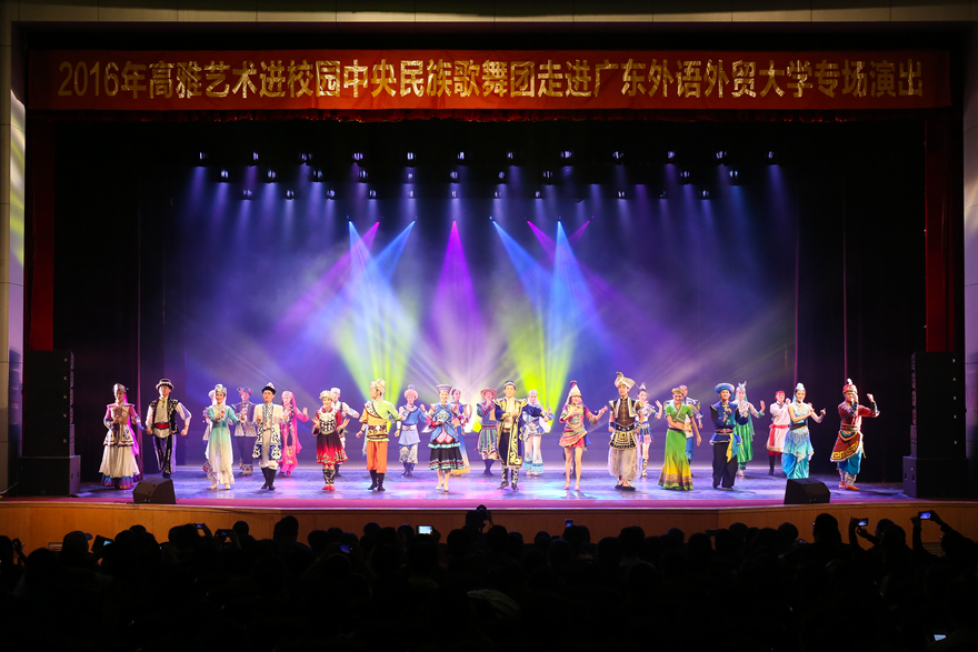 本次广东外语外贸大学专场演出由共青团广东外语外贸大学委员会主办,广东外语外贸大学学生艺术团体承办。高超的技艺和艺术修养,精美的民族服饰,美轮美奂的舞台效果,中央民族歌舞团为我校师生带来了一场高水准、高质量的视听盛宴。少数民族歌舞艺术,是少数民族历史与文化的结晶。它带着山野的清新,带着岁月的回声,更带着少数民族兄弟姐妹们对家园和生活的热爱。此次活动为师生创造了近距离欣赏高雅艺术的机会,也拉近了少数民族艺术与师生们的距离,极大地丰富了校园文化,对提升师生的文化素养也起到了积极的作用。