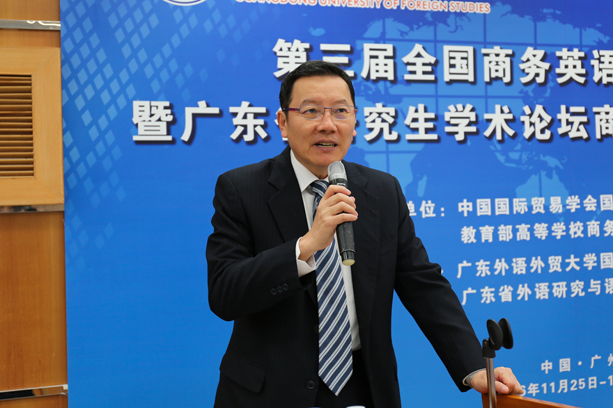 本网讯 11月25日上午,第三届全国商务英语语言学研讨会暨广东省研究生学术论坛——商务英语研究生论坛在我校MBA教学楼召开。来自各高校的商务英语专业教授,学科带头人等知名学者共聚一堂,开展主旨演讲和讨论。我校副校长方凡泉,国际语言服务与管理研究所所长、对外经济贸易大学英语学院教授王立非,对外经济贸易大学博士生导师徐珺,湖南大学外国语学院教授莫再树,我校国际商务英语学院党委书记车小真等出席论坛。论坛由我校国际商务英语学院院长郭桂杭主持。