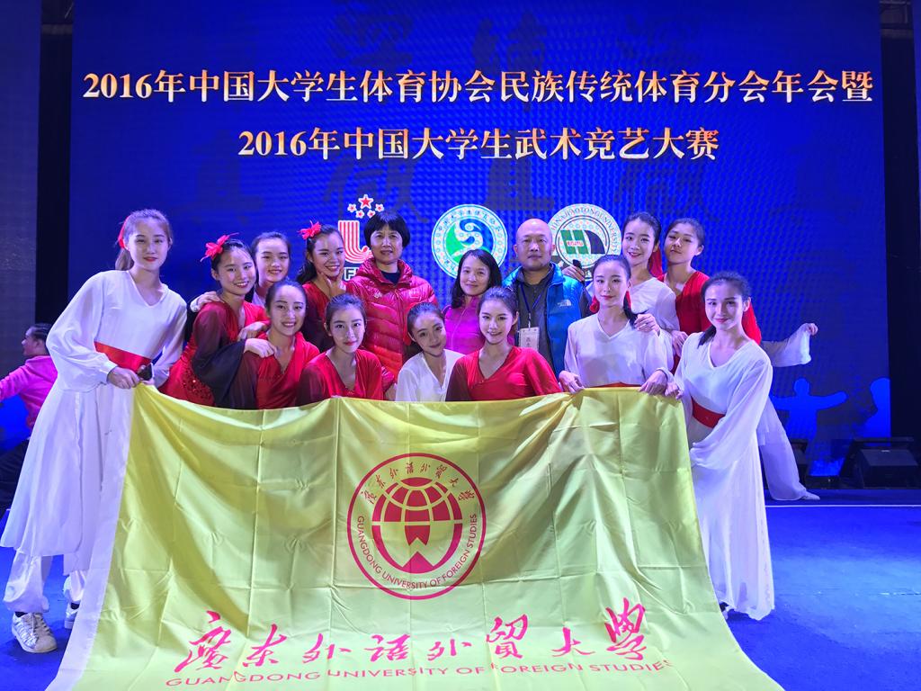此次参赛队伍的12名队员均由读舞蹈专业的大一、大三学生组成。在一个月的准备时间里,教练员与队员们齐心协力,充分利用课余时间加紧训练,尽全力去完成作品,展示了广外学子积极进取、青春激昂、团结刻苦的精神风貌,体现了“武德”、以和为贵的仁义精神以及内外兼修、顽强拼搏的武术精神。