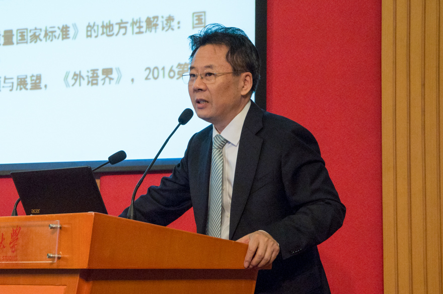 会议第一阶段由英指委副主任委员石坚主持,我校副校长刘建达致欢迎辞。外指委秘书长孙有中在讲话中表示,当前继续推进教师培养和教学改革工作具有重要意义。他强调,在中央开展高校思想政治工作会议的背景下,外语教育的教学内容应随之调整,要“回归常识,回归本分,回归初心,回归梦想”。孙有中进一步提出明年工作的重点,一是在《外语类专业本科教学质量国家标准》(以下简称“国标”)发布后召开外指委全体会议,深入解读“国标”;二是召开外语类专业本科教育改革发展研讨会,解决实际问题;三是参照大“国标”,对外语类各专业的小“国标”并进行跨语种的审读校对工作;四是做好宣传并落实各项工作,推动外语院校的改革与发展。
