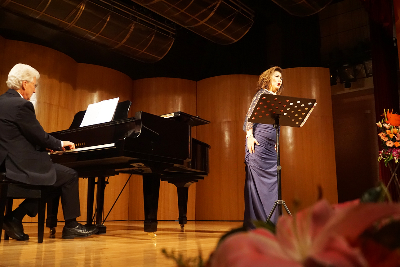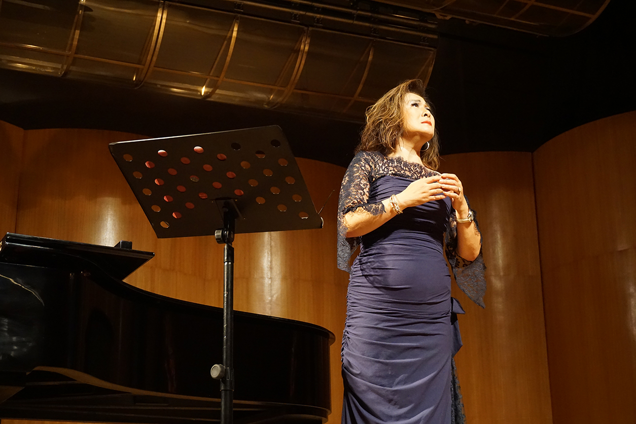 广外新闻网讯 11月19日下午,南校区艺术楼小剧场座无虚席。现居瑞士的著名女中音歌唱家李怡萍在瑞士苏黎世国家歌剧院顶级钢琴艺术指导托马斯先生的伴奏下,在这里举行独唱音乐会“丝绸之路的歌声”,让观众的耳朵与心灵都享受到了一场饕餮盛宴。