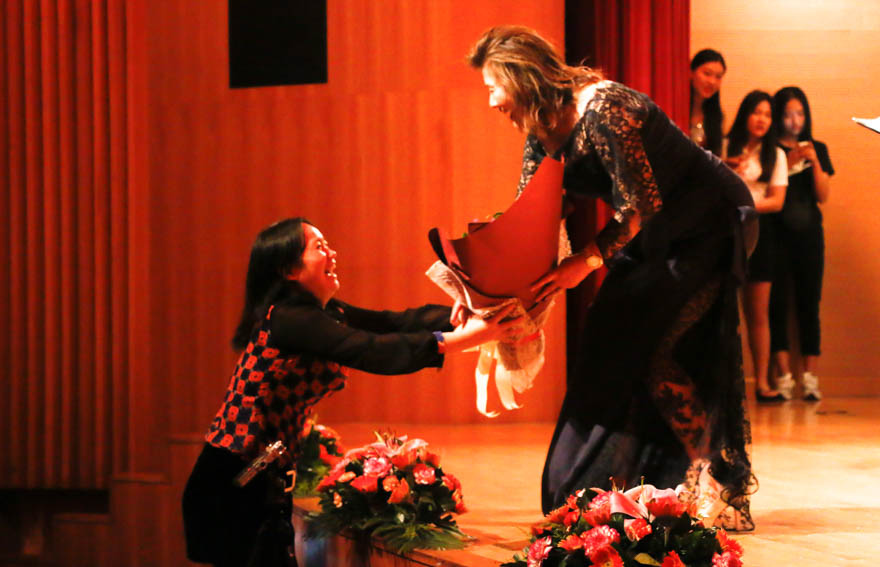 在这次音乐会的最后一部分,李怡萍选择了演绎她日夜思念的家乡的民歌,“我从小在新疆长大,只要我一唱那些我从小唱的歌就……”李怡萍话未说完便已满眼泪水。《一杯美酒》这首新疆民歌在李怡萍圆润高亮的歌声中展现出了新疆歌曲独特的艺术魅力,让观众感受到了新疆人民的热情与奔放。《梅娘曲》更是在其如泣如诉的歌声中体现出梅娘复杂而又纠结的内心情感。广外声乐专业的殷同学表示:“李老师用她的表现力把观众带入那个情景中,又用她的声音中的情感让观众深陷其中”。而在最后的《帕米尔我的家乡多么美》中,李怡萍用其开阔嘹亮的嗓音向大家再现了家乡辽阔而引人入胜的风景,掌声久经不息。李怡萍还特地向曾经教她歌唱、鼓励她走出新疆的伯乐齐老师表达了她深深的感谢,正是齐老师的独具慧眼让李怡萍从一个普通的新疆女孩蜕变成为今天的歌剧女王。