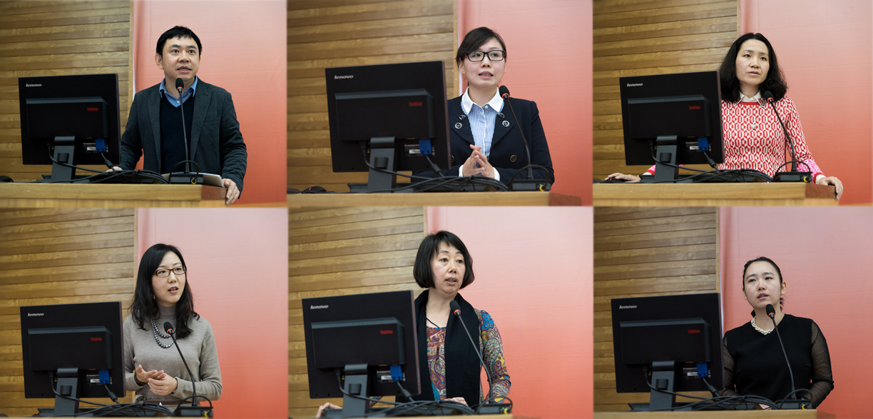 我校国家级教学团队——英语口译系列课程团队随后作集体发言。詹成详细解释了口译教学“广外模式”的理念与原则。“针对不同层次的学生,教学重点也不一样。采用何种方法,取决于课程定位。教学设计环节也应符合教学目标。”他分享了一系列见解,如双语能力,言外知识,口译技能是译员基本能力。他提出教学中应避免的误区,并根据图表解释、总结了口译教学的“广外模式”——“以理论板块课程进行指导,以技能主线课程进行技能分解、语言主线和专题主线课程进行技能强化,以实践板块课程进行技能整合”。唐芳、王丹、贾兰兰、詹成、张丽华分别介绍了理论板块、技能主线、专题主线、语言主线和实践板块的课程设置和教学操作。王巍巍则介绍了如何通过口译评估来评量学生的学习效果和能力发展。