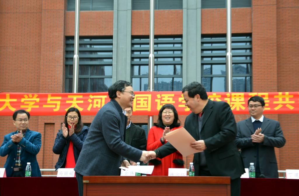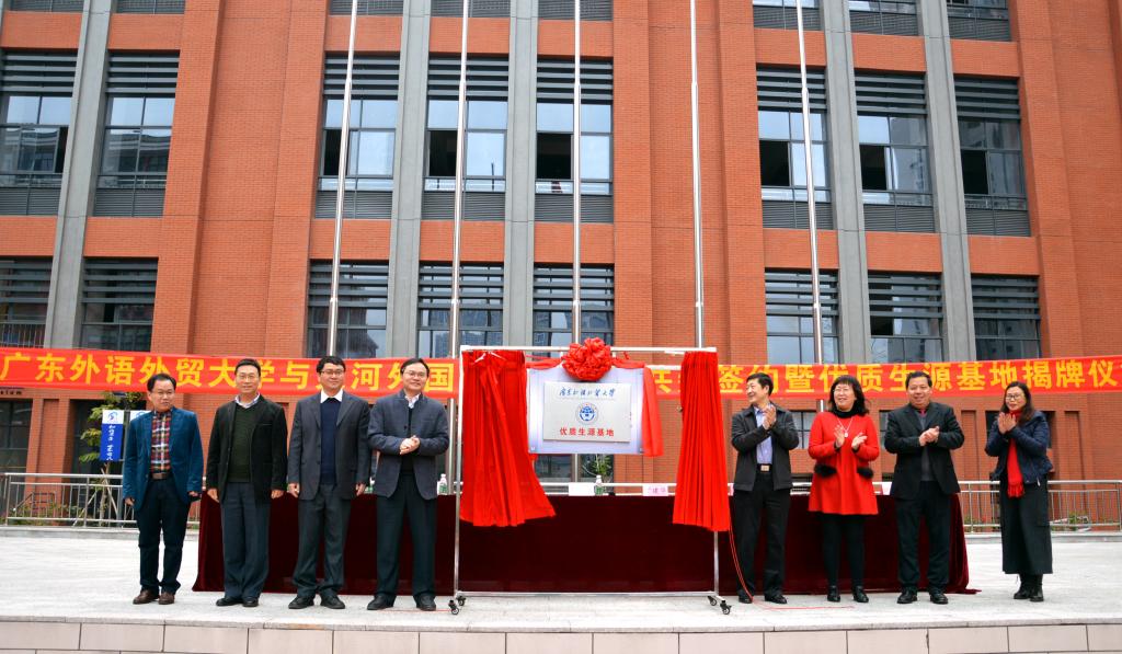 本网讯 2月21日下午,我校与广州市天河外国语学校课程共建签约暨优质生源基地揭牌仪式在天河外国语学校举行。广州市天河区副区长丁建华、天河区教育局副局长谢向红、天河外国语学校校长崔海友和我校副校长刘建达、招生办主任袁长青、英语教育学院院长董金伟等出席签约仪式。