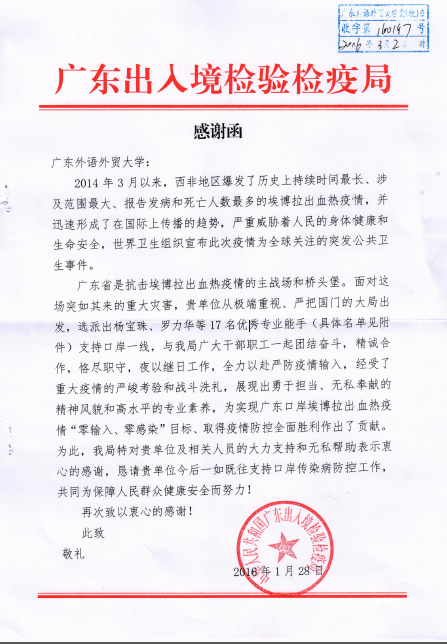 3月,我校收到了一封来自广东出入境检验检疫局的感谢函——“衷心感谢志愿者团队的大力支持和无私帮助,他们经受了重大疫情的严峻考验和战斗洗礼,展现出勇于担当、无私奉献的精神风貌和高水平的专业素养,为实现广东口岸埃博拉出血热疫情‘零输入、零感染’目标、为取得疫情防控全面胜利做出了贡献。”