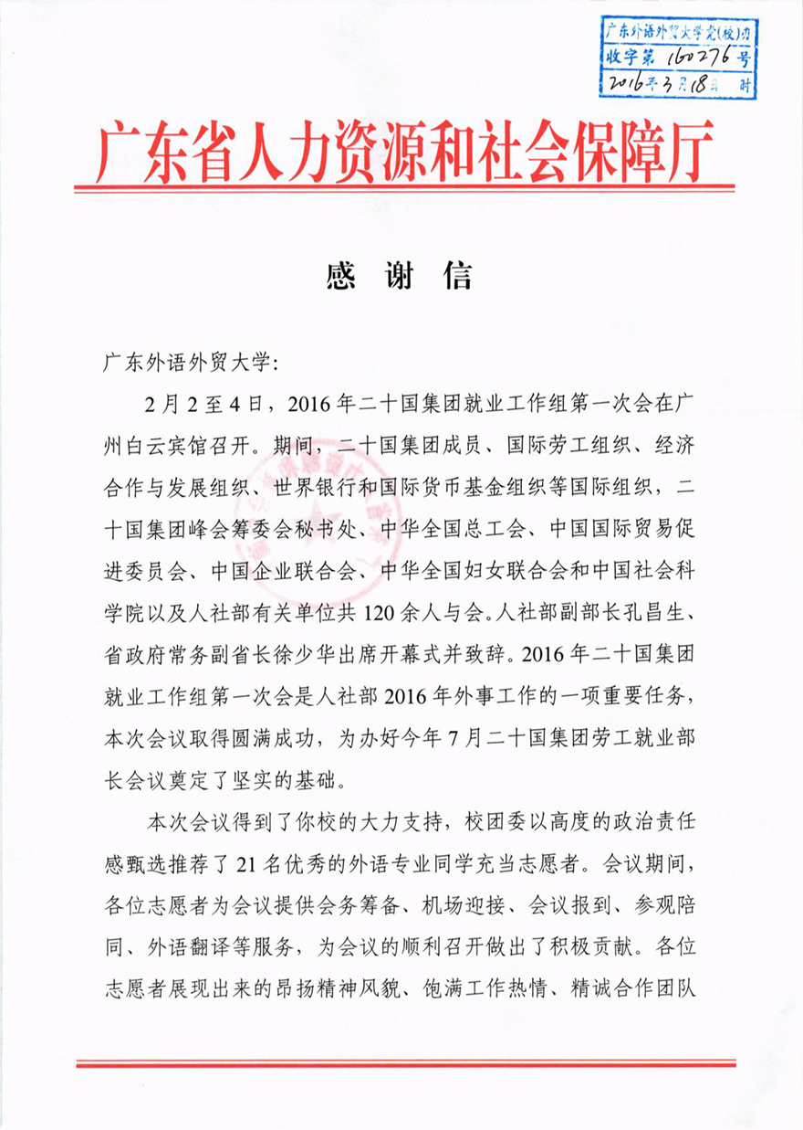 本网讯3月18日,校办收到来自省人社厅的感谢信,感谢我校21名外语志愿者为二十国集团就业工作组第一次会议(以下简称G20)提供外语翻译、参观陪同、机场迎接、会务筹备等志愿服务。