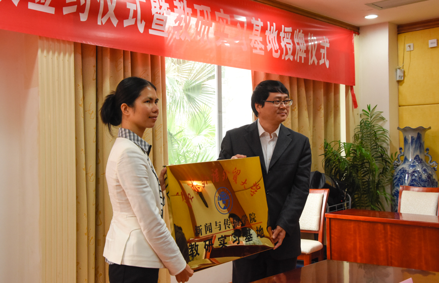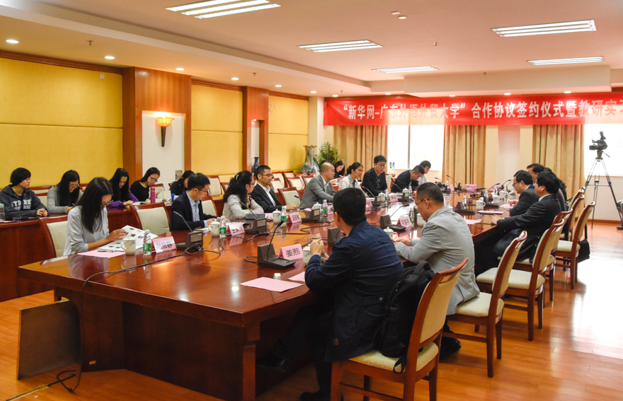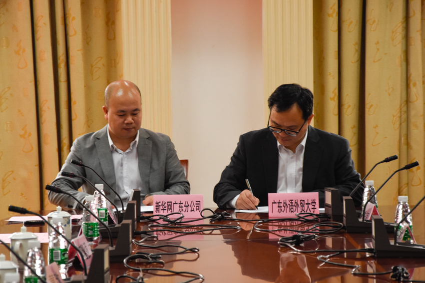 本网讯3月31日上午,“新华网-广东外语外贸大学”合作协议签约仪式暨教研实习基地仪式在我校行政楼第一会议室举行,副校长刘建达,新华网广东分公司总经理兼总编辑汪金生以及相关部处负责人、新闻学院师生代表等出席。仪式由新闻学院院长杨魁主持。