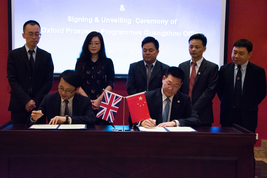 本网讯 4月17日上午,牛津大学王士东博士、助理陆昱晨来我校参观访问,签署牛津大学伍斯特学院(Worcester College)一年定向访问学生项目协议,该项目由牛津展望计划项目组负责,并举行了牛津展望计划广州办公室揭牌暨签约仪式。我校校长仲伟合与王士东代表双方签署了协仪,并向王士东颁发了客座教授聘书。