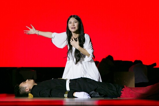 红旗袍,绿军装,中式神台,佛家钟声,这些极富中国元素的布景有些突兀地出现在英文舞台上,让观众不禁疑惑也更加不由自主地目不转睛。剧组别出心裁地将《麦克白》改编的中国风作品,把场景设置在民国动乱时期。浓郁的东方风情与独特的西方演绎方式向结合,诉说了男主角Hanting被权势蒙蔽双眼而妄图杀害父兄,让家族破碎兄弟反目的故事。