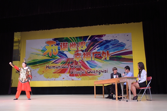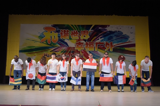 广袤园武术协会带来了精彩的武术表演——《精武风云》。随着武者们上场,舞台上旗帜飞扬、刀光剑影、舞枪弄棒,在雄厚的吼声中打出一套套精彩纷呈的拳法,可谓酣畅淋漓。在一招一式中尽显英雄本色,也将中国的传统武术展现给了现场的中外观众。来自瑞士、刚果、几内亚、阿塞拜疆等国家的7位同学表演了小品《笑傲招聘》。在表演之中融合了大量的中国元素,将《鹿鼎记》、《笑傲江湖》、《倩女幽魂》、《水浒传》等名著中的典故化为今用,扮演面试官的瑞士男生Geff还使用了“有木有”、“hold住”、“喜当爹”等网络新语,使现场观众欢笑连连。