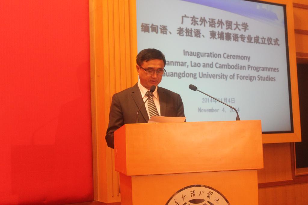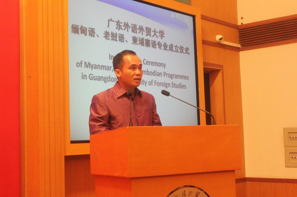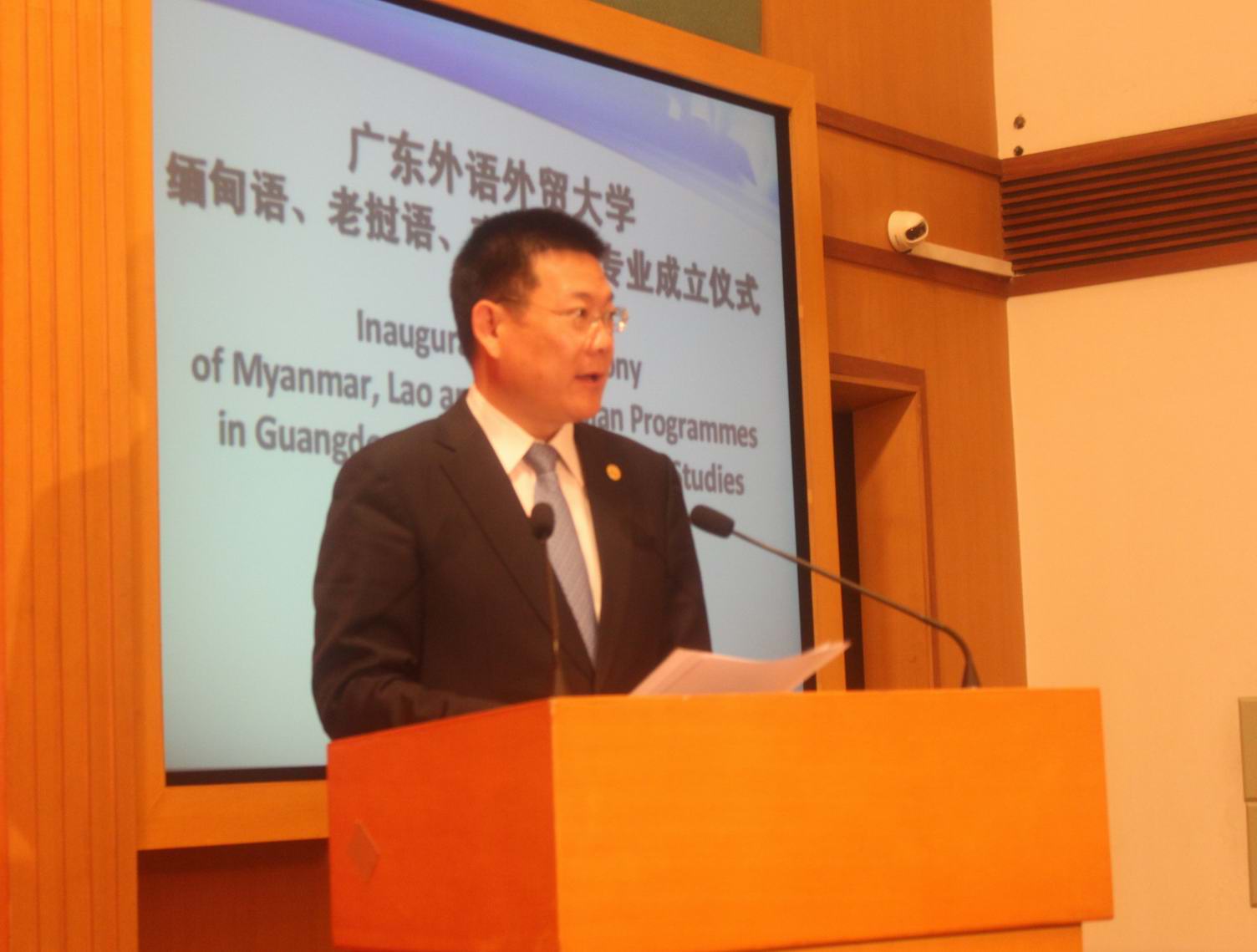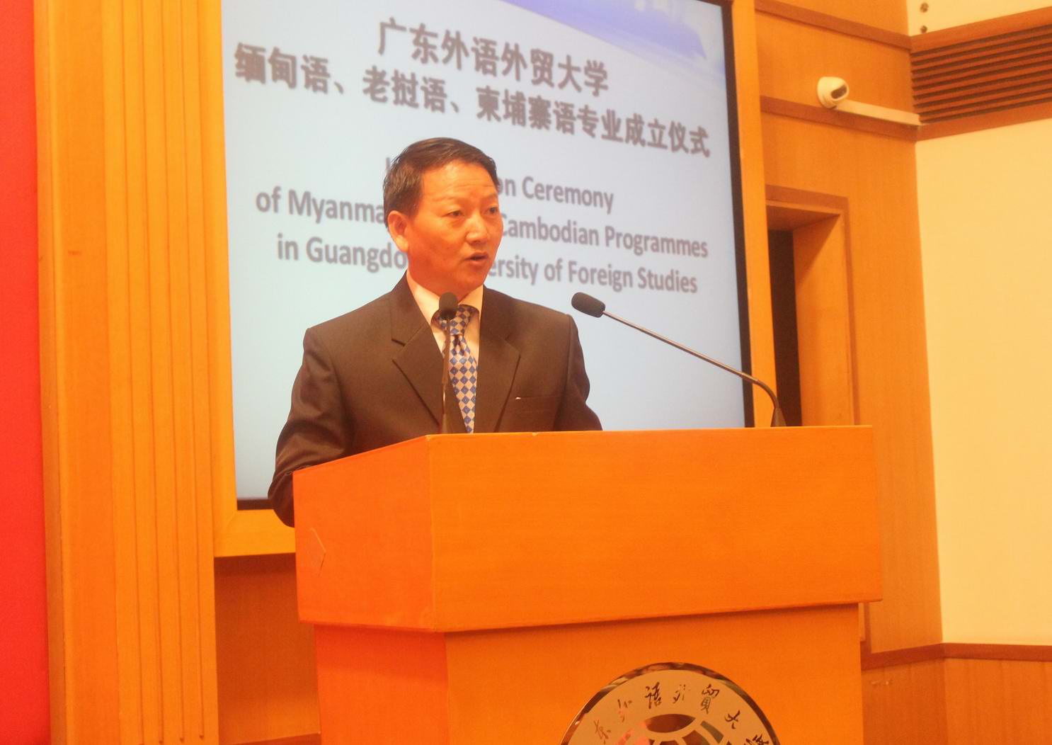 在致辞中,仲伟合表示广外历来重视东南亚语种专业的建设,早在上世纪六十年代,广外的前身——广州外国语学院成立之初,就设立了越南语、泰语、印尼语等专业。如今缅甸语、老挝语和柬埔寨语三个全新专业的成立,无疑进一步确立了广外作为华南地区外语教学与研究“领头羊”的地位。谈到新增的三个专业,仲伟合表示,随着中缅之间、中老之间以及中柬之间的经济贸易、文化交流的日渐频繁,这就对通晓缅、老、柬三国语言和社会文化的人才产生了很大需求。广东作为我国对外开放的门户,与缅、老、柬三国之间的合作前景十分广阔。在双边交往不断深入的大背景下,必将迎来更多新的机遇。为国家培养更多通晓三国语言和社会文化的外语人才,成为了广东外语外贸大学义不容辞的光荣责任。