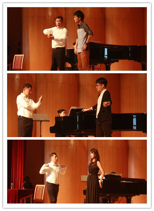 杨岩结合他多年教学经验形成的教学理论和方法,用风趣幽默的语言,生动形象的例子,为现场所有师生展示了声乐教学及学习中的精妙。他指出,要唱得好首先要有好的钢琴基础。其次,普通话和外语的发音对演唱也至关重要。此外,读词谱也是学习声乐的关键基础。在当天的大师课上,共有7名声乐学生上台进行演唱。杨岩认真聆听后,指出了每个学生演唱中存在的不足以及问题,并提出合理建议和改进方式。深入浅出的教学模式和严谨认真的教学态度使在场众多师生感触颇深,受益匪浅。