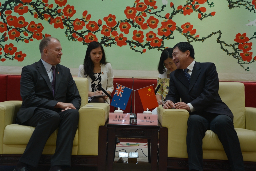 广外新闻网讯 4月13日上午,新西兰新任驻华大使麦康年JohnMcKinnon首次访问我校。这是他在广东高校行的第一站。我校党委书记隋广军在北校行政楼贵宾厅与麦康年举行会谈。新西兰驻广州总领事馆总领事陈立恩,总领事馆教育经理叶方珉,总领事馆研究官员谢翩翩,我校副校长方凡泉,国际处处长蔡红,战略研究院副秘书长陈寒溪及相关学院和部处负责人等随同会见。