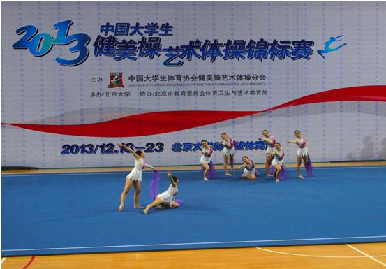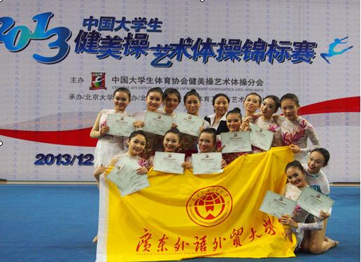 广外新闻网讯 近日,2013中国大学生体协艺术体操锦标赛在北京大学体育馆进行。我校艺术体操代表队12名健儿们,在我校体育部书记李旭武、教练师小蕴带领下,共参加了大学组4个集体项目和12个个人项目的比赛。在本次大赛中,我校艺术体操代表队获得了大学组团体亚军,并夺得一金三银一铜的奖项。