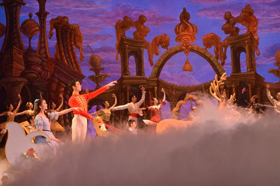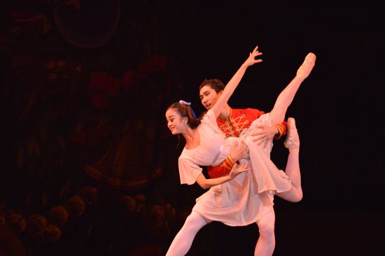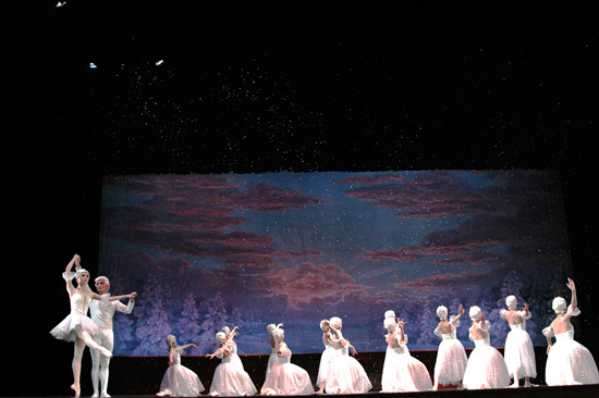 这一幕,在美妙的芭蕾舞中融合了热情奔放的西班牙舞、庄重缓慢的印度舞、粗旷豪迈的俄罗斯舞以及精巧别致的中国舞。雪后与王子的双人芭蕾,时而浪漫华丽,时而沉谧平和,时而轻快诙谐。别致的背景和绚丽的舞美灯光如仙境一般。