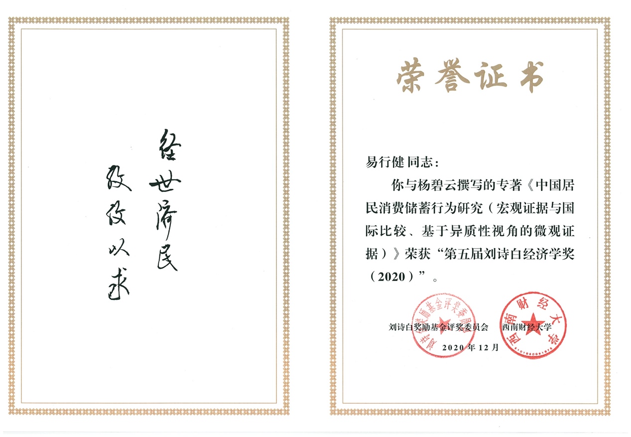 近日,我校云山杰出学者、金融学院院长易行健的成果《中国居民消费储蓄行为研究:宏观证据与国际比较、基于异质性视角的微观证据》获第五届“刘诗白经济学奖”。