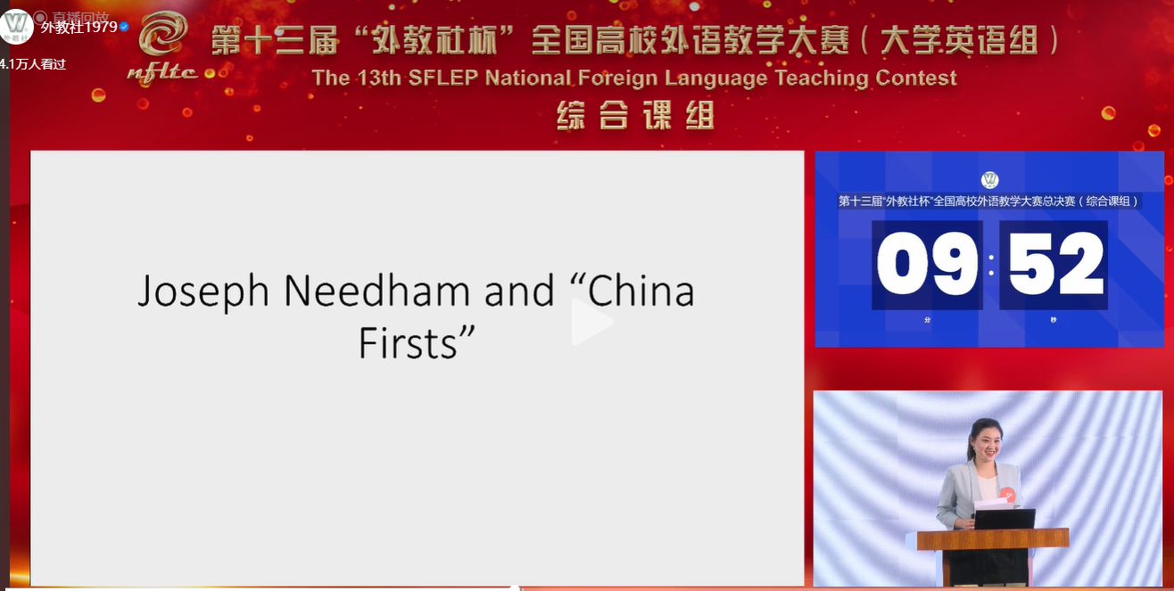 在说课环节中,范栩颖在有限时间里对“Joseph Needham and ‘China Firsts’”一文进行深入全面分析,有效地体现了教学思路的高阶性、授课步骤的科学性与教学方法的创新性。在提问环节中,范栩颖与提问专家梅德明教授就文本内容等进行探讨,获得了评委们的高度评价,为场内外观众献上了一场精彩绝伦的教学盛宴。