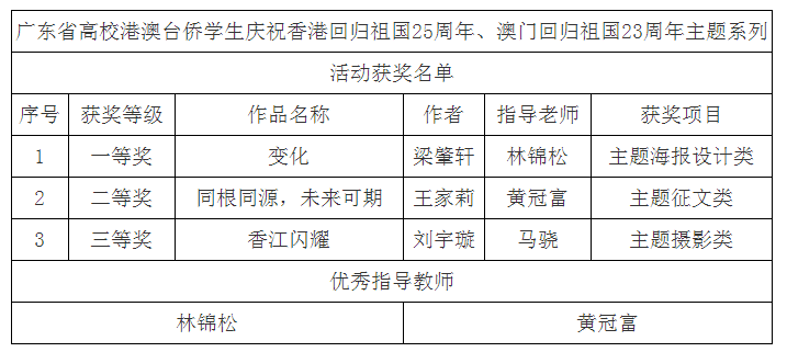 近日,广东省教育厅公布了2022年广东省高校港澳台侨学生庆祝香港回归祖国25周年、澳门回归祖国23周年主题系列活动获奖名单,我校共28名港澳台与内地师生参加,最终荣获一等奖1项,二等奖1项,三等奖1项,2名教师获得“优秀指导教师”称号,我校荣获“优秀组织奖”称号。