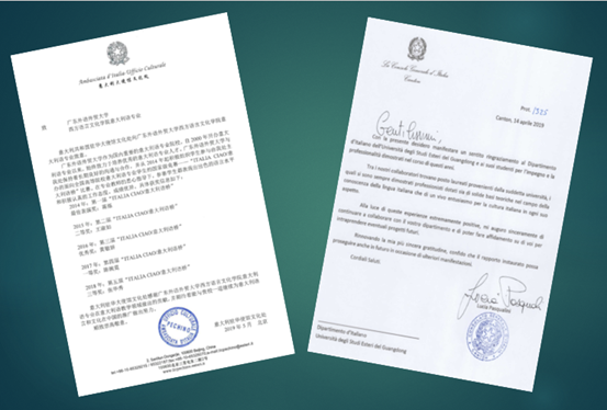 意大利驻华使馆文化处以及意大利驻广州总领事馆对广外意大利语学生的表扬信